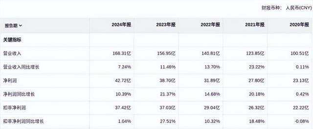 到2024年年报披露后,上述三项数据上升至168.31亿、42.72亿、37.42亿,分别累计增长了67.46%、84.7%、68.41%,折合年化分别为13.76%、16.58%、13.92%,始终保持着增长态势。